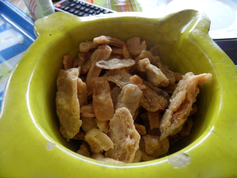 En un mortero ponemos los chicharrones y los vamos machacando, han de quedar bastante deshechos. Han de ser de calidad, si no la coca nos quedara fatal.